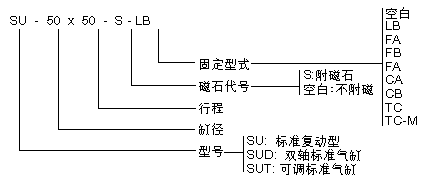 欲订购缸径为63mm,行程为80mm,附磁, 采用LB固定型式的标准复动型气缸,其正确的订购码代号为: SU-63 x 80-S-LB.