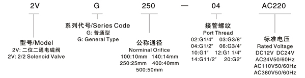 ■ 产品特点 ◆ 适用于:气、水、油品、弱酸、弱碱 ◆ 噪声低:无水锤冲击,颤抖声 ◆ 工作平稳、流量大 ◆ 可靠性高、寿命长 线圈:热固性塑料包覆 IP65保护制式 ◆ 更换先导头及线圈可作防爆阀用 ■ 举例 ▲ 欲订购接管螺纹为G1/4",标准电压为DC24V,公称通径为25mm,2VG系列电磁阀,其正确的订购码为:2VG250-02-DC24V | ||||||||||||||||||||||||||||||||||||||||||||||||||||||